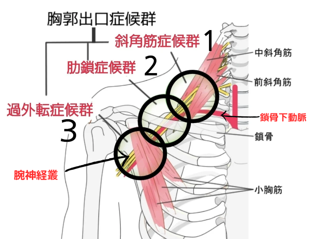 神経や血管が圧迫される部位によってそれぞれ名称があり、それらを総称して胸郭出口症候群と呼びます。