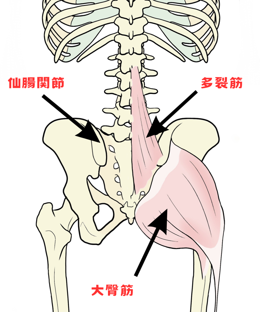 多裂筋は、仙骨と腸骨を関節している部位(仙腸関節)でお尻の筋肉の大殿筋と連結しています。